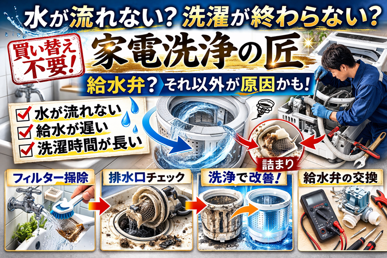 「スタート押したのに、いつまで経っても水が入らない」「給水はしてるっぽいけど、チョロチョロで終わらない」「洗濯が“残り○分”から減らず、1時間以上かかる」 この手の相談、実はかなり多いです。結論から言うと、給水弁(給水バルブ)だけが犯人とは限...